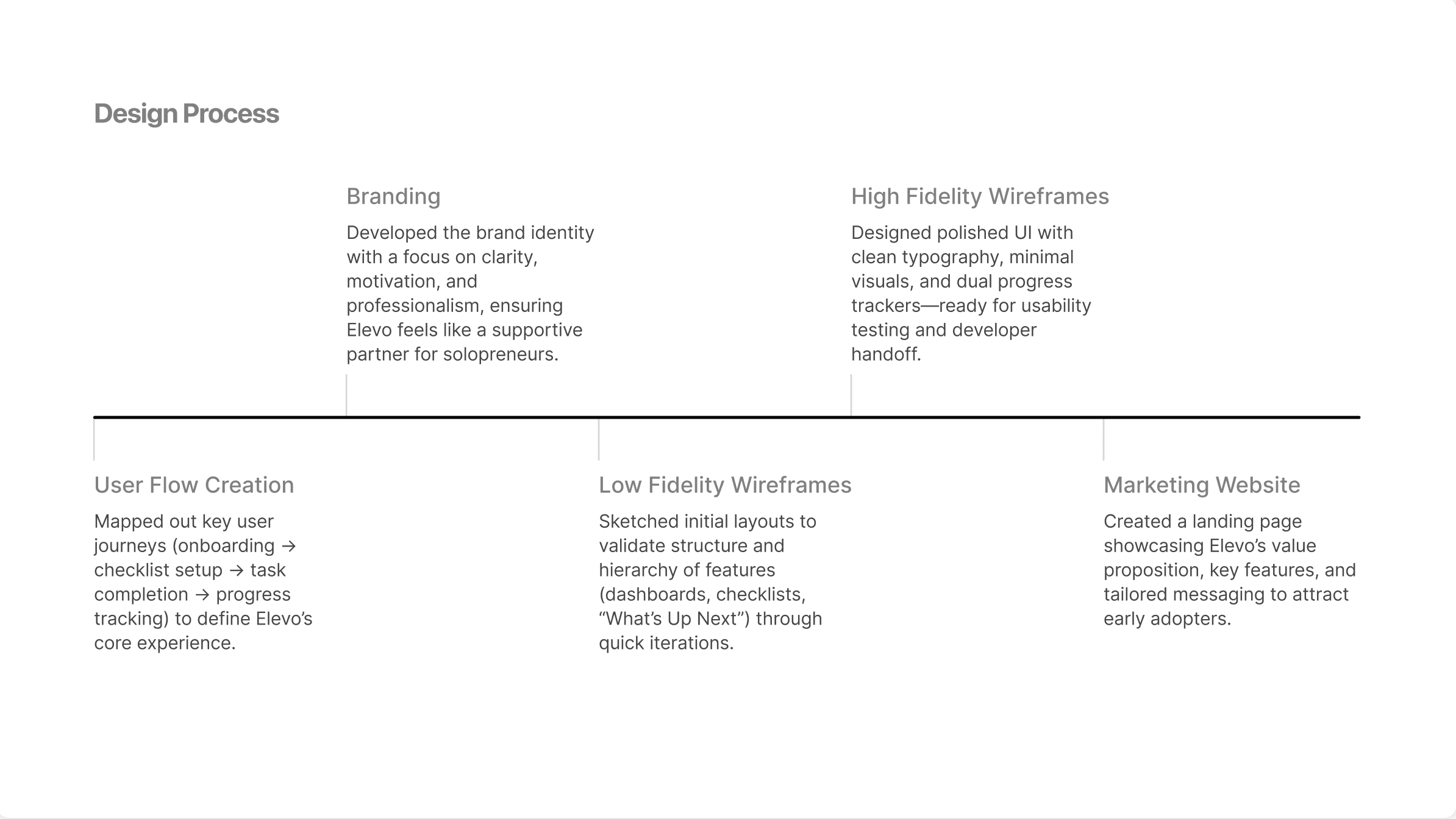 Every element of Elevo was designed with the user in mind. The interface features intuitive interactions, smooth motion design, and consistent visual language that enhances focus and usability. I prioritized accessibility and readability, using clear type scales, contrast ratios, and a flexible color palette that adapts to both light and dark modes.